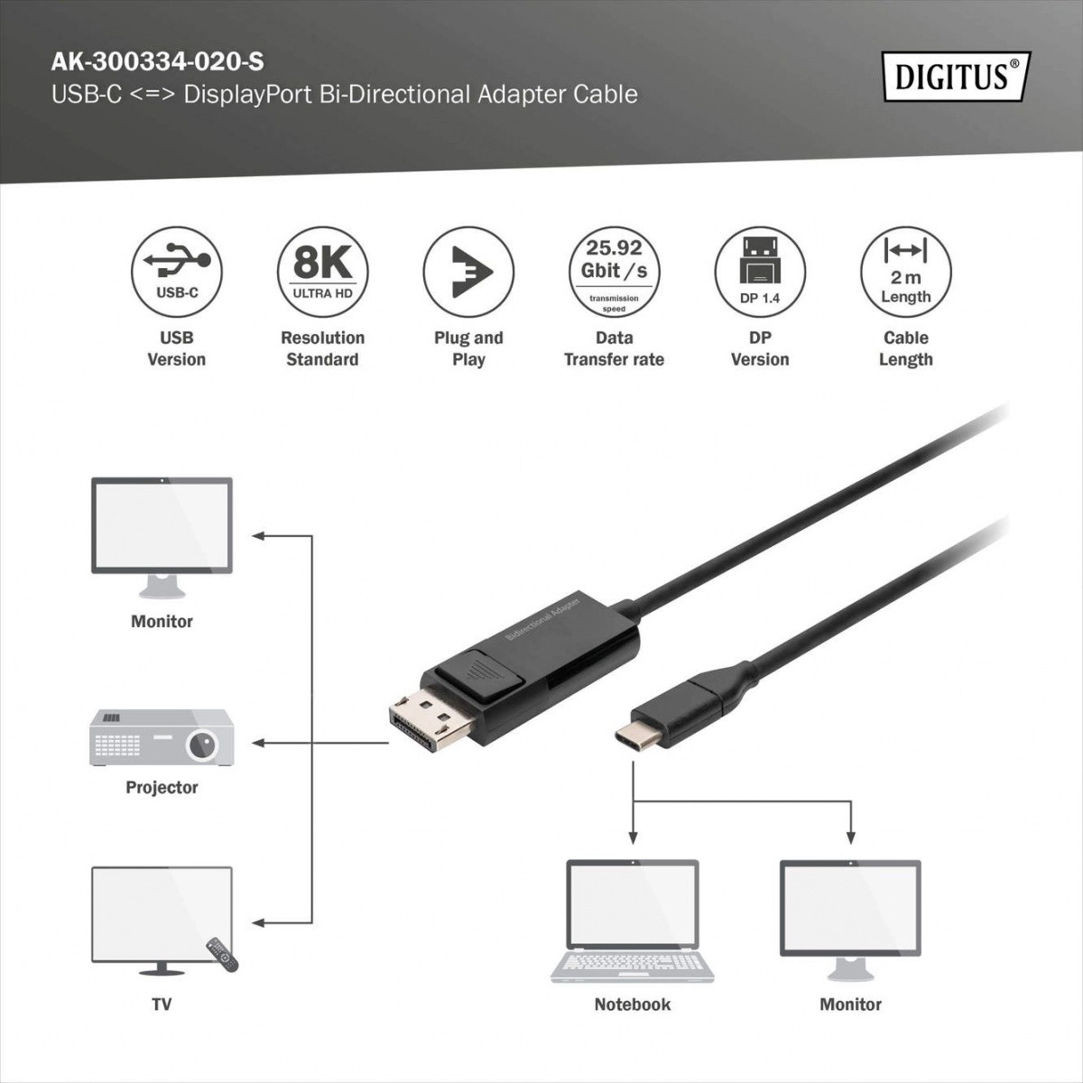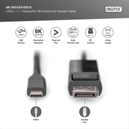 De USB type C – bidirectionele DisplayPort-kabeladapter van Digitus ondersteunt overdracht zowel van USB type C naar DisplayPort als omgekeerd. Met deze kabel sluit je bijvoorbeeld een laptop met USB‑C-poort aan op een monitor met DisplayPort-interface, of een desktop met DisplayPort‑uitgang op een monitor met een USB‑C‑poort. Deze adapter wordt volledig via USB gevoed, waardoor externe voeding niet nodig is.