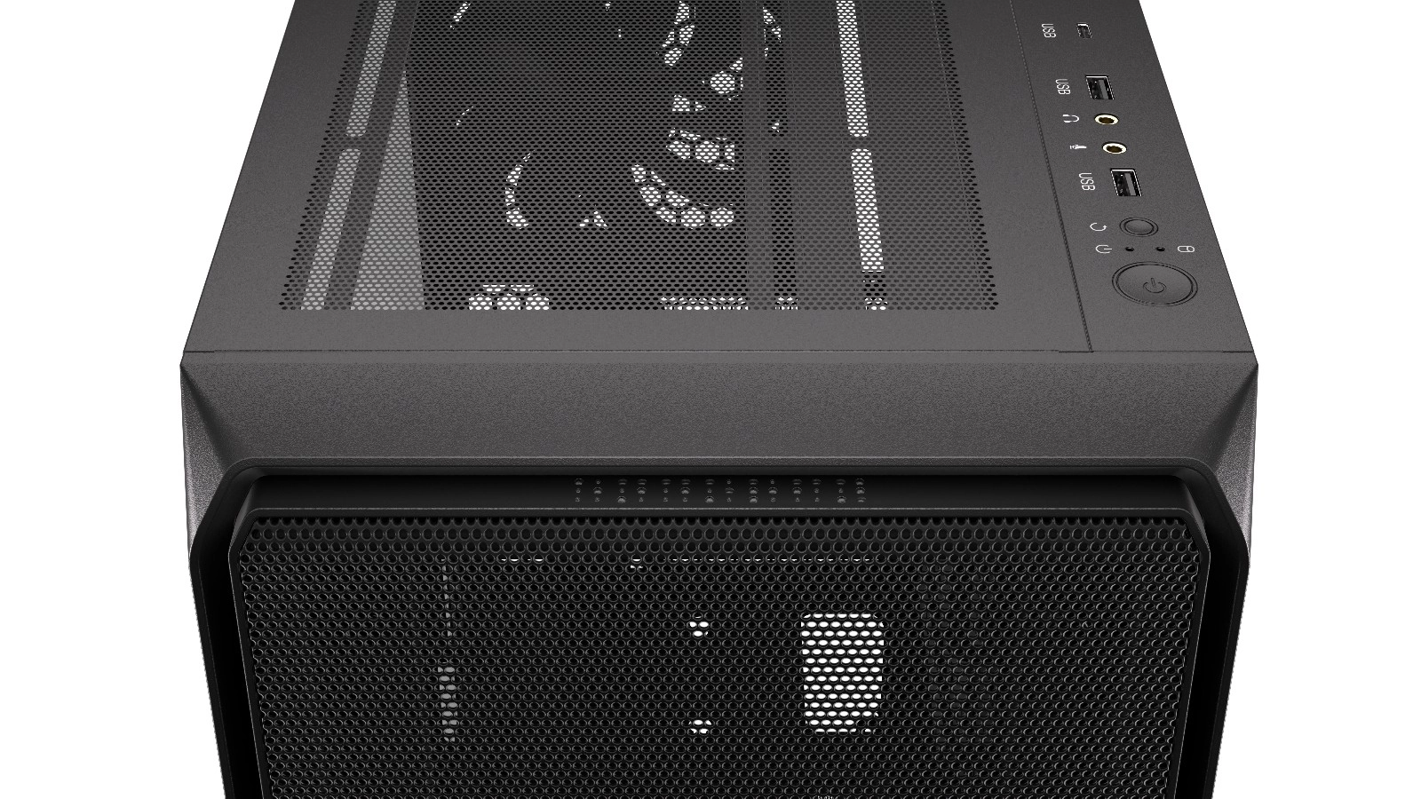 Modern paneel met USB-C: Het paneel biedt snelle verbinding via USB-C 3.2 Gen 2, twee USB-A 3.2 Gen 1 en audio-aansluitingen voor koptelefoon en microfoon.