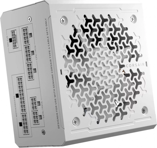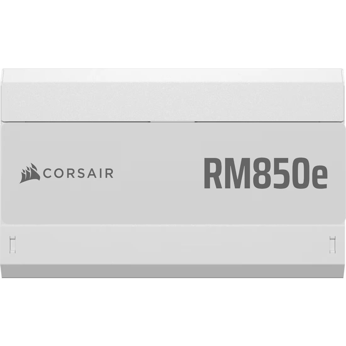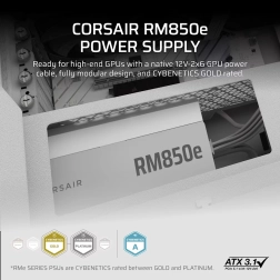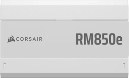 Witte Corsair RM850e-voeding is een volledig modulaire ATX-voeding met lage geluidsproductie en ATX 3.1-certificering. Biedt hoge prestaties en betrouwbaarheid dankzij de Cybenetics Gold-standaard en verbeterd kabelbeheer.
