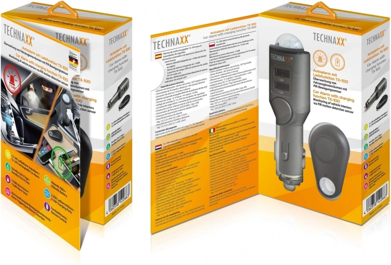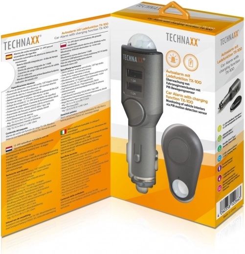 De Technaxx TX-100 autoalarm is een klein apparaat dat in de sigarettenaansteker van een voertuig wordt geplaatst. Het combineert de functie van een autoalarm met een 2-port USB-oplader, ideaal voor het opladen van uw mobiele apparaten.