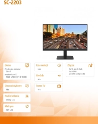 De 22'' SC-2203 monitor is ontworpen voor efficiënte weergave van content met oog voor esthetisch design. Deze monitor is voorzien van LED VA-technologie, die levendige kleuren en scherpe details levert, waardoor hij ideaal is voor elke werkomgeving of het bekijken van multimedia. Dankzij de mogelijkheid tot aansluiting via HDMI-, VGA- en BNC-connectoren is de monitor zeer flexibel.