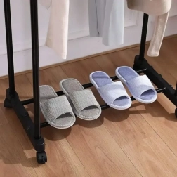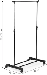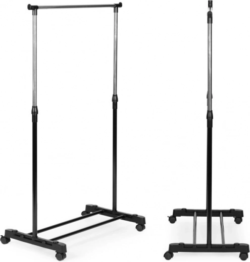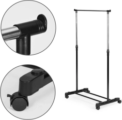 De uiteindelijke houders aan de steunbalk van het rek zorgen voor veiligheid en elimineren het risico van onbedoeld uitglijden en beschadiging van kleding. De balk fungeert ook als haak voor het ophangen van tassen, sjaals, hoeden en andere kleinigheden. Het kledingrek is uitgerust met vier wieltjes, waarvan twee vergrendelbaar. Dit maakt eenvoudige verplaatsing en flexibele organisatie van de ruimte mogelijk. Het is een praktische oplossing die eenvoudige aanpassing van het rek aan uw behoeften mogelijk maakt.