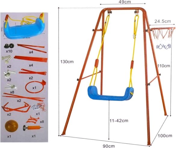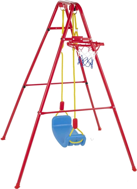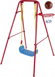 Deze veelzijdige tuinsschommel combineert het geliefde schommelen met basketbalplezier. Het stabiele metalen frame met buizen van circa 2,5 cm en het sterke touw dragen de brede kunststof zitting (ca. 43 × 25,5 cm) voor comfortabel en veilig gebruik. Inclusief basketbalring die eenvoudig op het frame kan worden bevestigd, plus een mini bal en pompje voor direct spelen.
