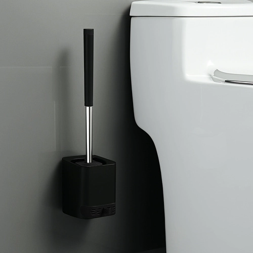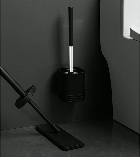 Elegante en hygiënische oplossing voor je badkamer: de RUHHY-toiletborstel met zwarte standaard en een halfgebogen kop met flexibele noppen zorgt voor effectieve reiniging, ook onder de rand, zonder krassen. Zonder spatten en zonder absorptie voor een schonere toiletomgeving. Montage zonder boren aan de muur met een zelfklevende houder of vrijstaand te plaatsen.