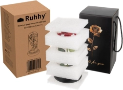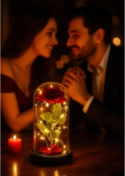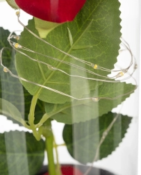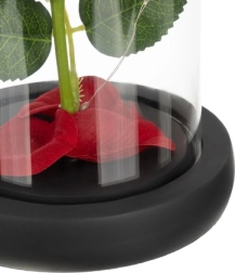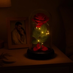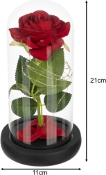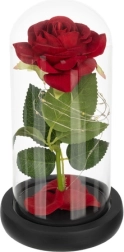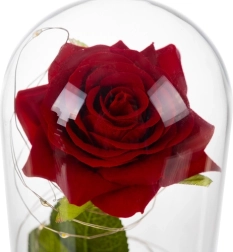 Deze prachtige roos is geplaatst in een hoogwaardige glazen koepel en is zo ontworpen dat hij zijn vorm en kleur voor altijd behoudt. De verlichting met LED's creëert een warm wit licht, wat de roos een uitzonderlijk uiterlijk geeft.