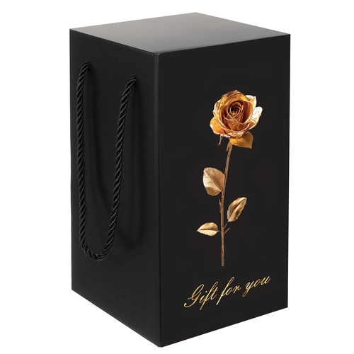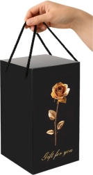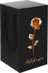 Elegante geschenkverpakking: De roos is zorgvuldig verpakt in een zwarte geschenkdoos met een gouden roos ontwerp, klaar voor elke gelegenheid. De doos is voorzien van handige zwarte koordhandvatten.