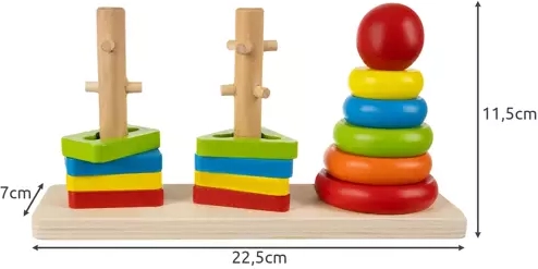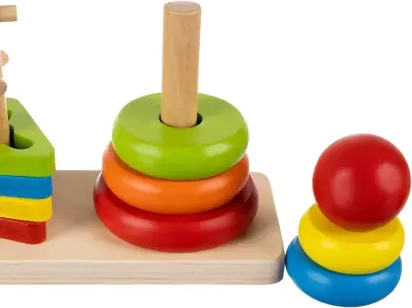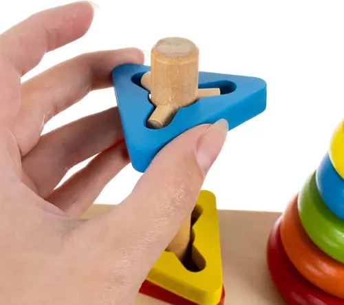 Maak kennis met drie basisvormen: cirkel, driehoek en rechthoek. Het speelgoed bevat een basis en verschillende stukken die gemakkelijk kunnen worden gemanipuleerd en gestapeld.