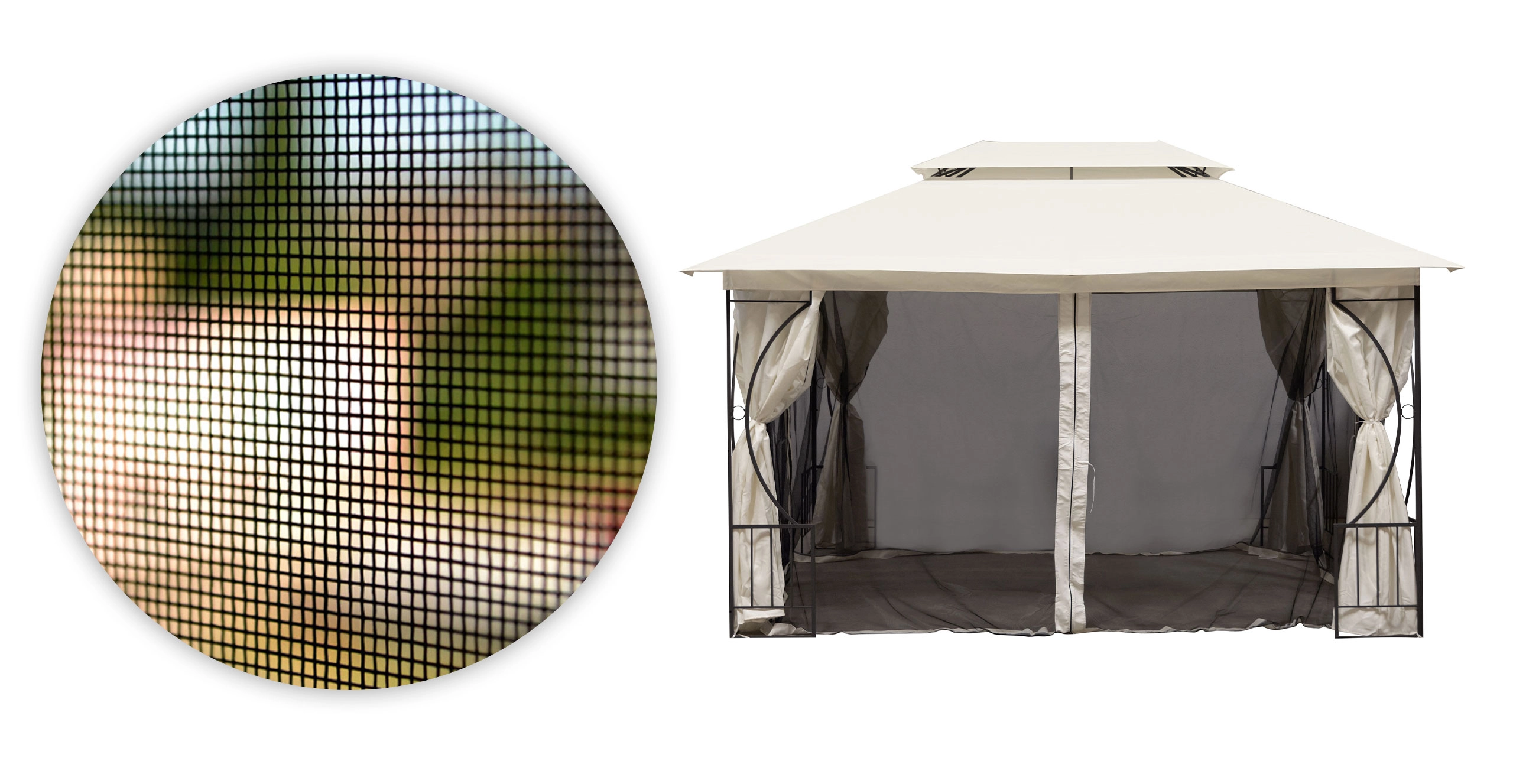 Gemaakt van duurzame polyestervezels, staat dit net bekend om zijn weerbestendigheid. Het blokkeert effectief muggen, vliegen en andere insecten en creëert zo een beschermende barrière, terwijl uw contact met de natuur behouden blijft. De mesh-structuur blokkeert geen natuurlijk licht of luchtcirculatie, waardoor het paviljoen licht, luchtig en comfortabel blijft, zelfs op warme dagen.