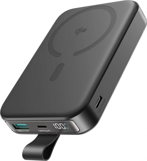 De powerbank biedt meervoudig opladen dankzij drie uitgangen: USB-A, USB-C en draadloos, wat het opladen van meerdere apparaten tegelijk mogelijk maakt. Ondersteuning voor Power Delivery zorgt voor tot wel drie keer sneller opladen in vergelijking met gewone opladers.
