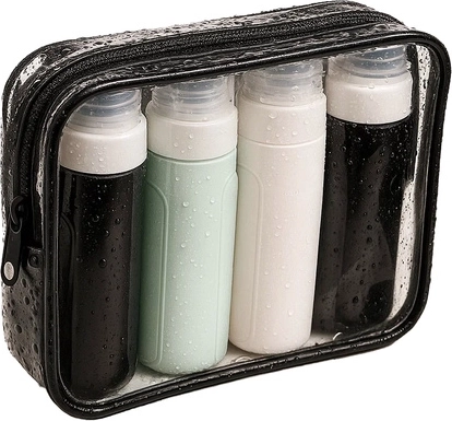 Reis-cosmeticaset met vier flexibele flesjes die voldoen aan de eisen van de luchtvaart, waterdicht en ideaal voor in het vliegtuig zijn. Biedt comfort en organisatie onderweg.