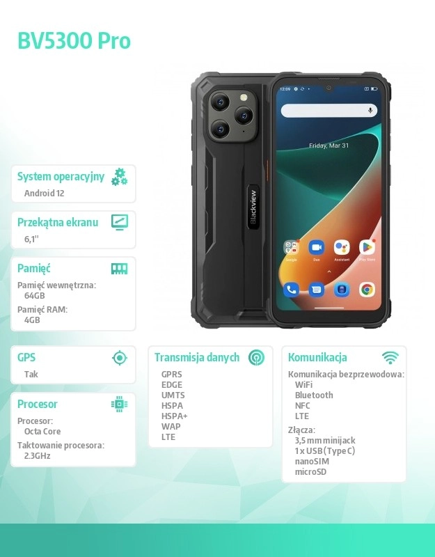De Blackview BV5300 Pro blinkt uit met zijn 6,1" IPS-scherm, dat een helder en scherp beeld biedt met een resolutie van 1560 x 720 pixels. De krachtige octa-core processor MediaTek Helio P35 haalt snelheden tot 2,3 GHz, wat zorgt voor een vlotte en snelle werking van het systeem, ondersteund door 4 GB RAM en 64 GB interne opslag. De opslag kan worden uitgebreid met een microSD-kaart tot 512 GB, wat ruim voldoende plaats biedt voor al uw behoeften.