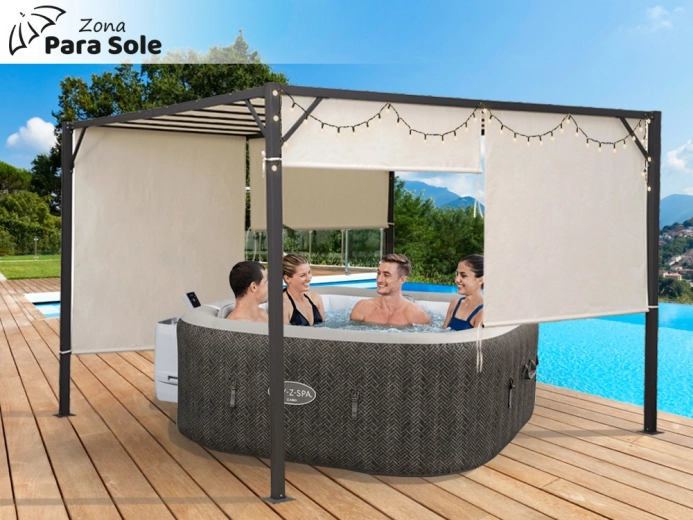Met deze Pergola Para Sole Zona, die elegantie en functionaliteit combineert, zorgt u in uw tuin of op uw terras niet alleen voor een aantrekkelijke uitstraling, maar ook voor praktische oplossingen. De pergola met afmetingen 3x3x2 meter biedt voldoende ruimte voor ontspanning, sociale bijeenkomsten of familiediners in de buitenlucht.
