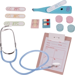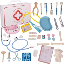 De set bevat verschillende instrumenten, waaronder een stethoscoop, thermometer en tandmodel, wat de kinderen een complete dokterservaring biedt.