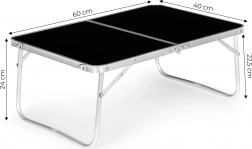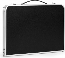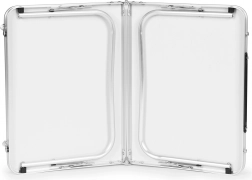 Deze compacte tafel is uitgerust met bescherming tegen onbedoeld opvouwen en een comfortabel transporthandvat, wat eenvoudige hantering garandeert. Hij kan worden opgevouwen tot een koffer, wat het transport en opslag vergemakkelijkt.