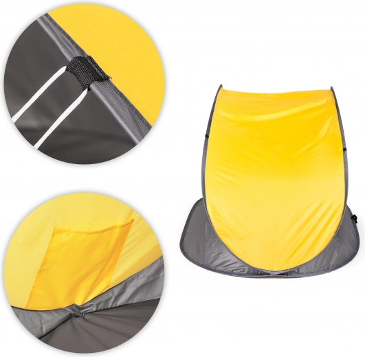 De tent heeft een praktische binnenzak, ideaal voor het opbergen van telefoon, sleutels of kleine accessoires, zodat ze bij de hand zijn en beschermd tegen zand en zonlicht.