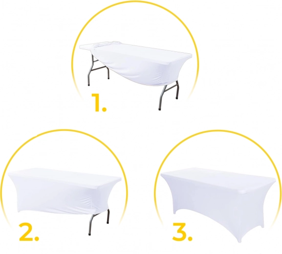- Snel en eenvoudig aan te brengen – in enkele minuten over het tafelblad trekken, de hoeken uitrekken en aan de poten vastmaken.