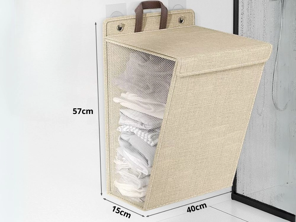 Geen rommel meer rond de wasmachine. Deze hangende wasmand met ademende mesh en verstevigde wanden benut de verticale ruimte optimaal en bespaart vloeroppervlak. De moderne beige tint past gemakkelijk bij de meeste interieurs.