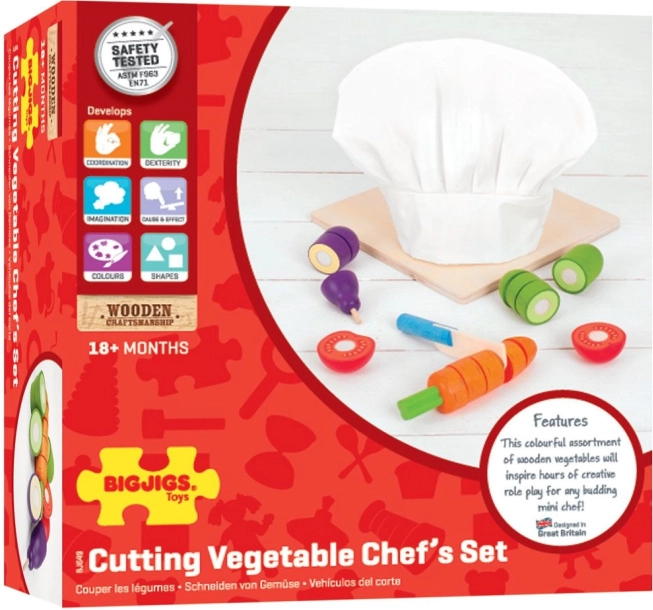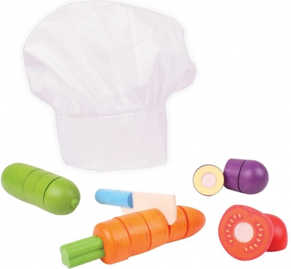 Deze hoogwaardige houten set is een geweldige introductie tot de wereld van koken. Kinderen kunnen groenten “snijden” met het houten mes en ze dankzij het klittenband weer aan elkaar maken, waarmee ze oog-handcoördinatie en fijne motoriek ontwikkelen. Inclusief een witte koksmuts voor nog meer fantasierijk spel.