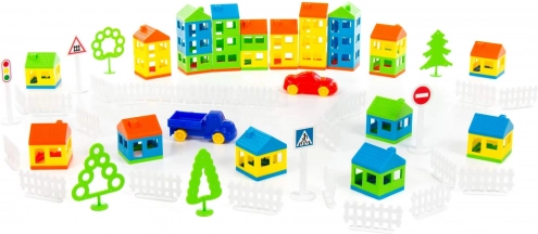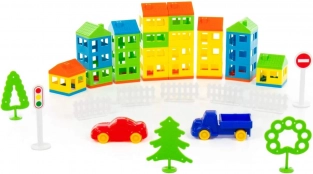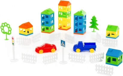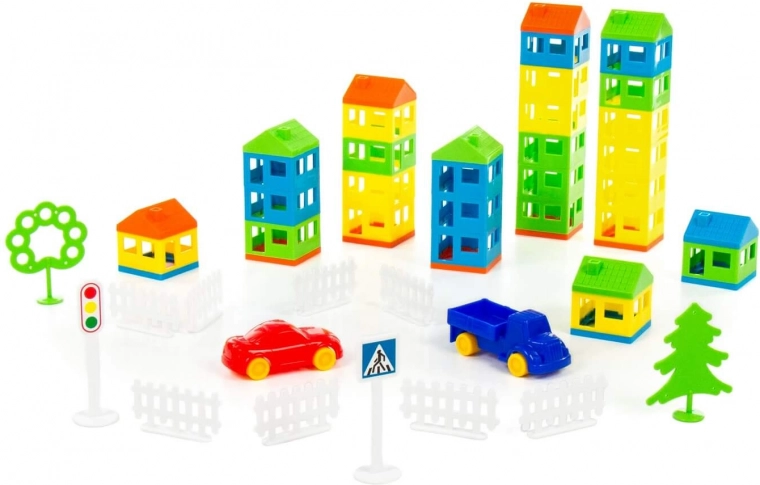 De bouwset ontwikkelt de fijne motoriek, hand-oogcoördinatie en prikkelt tegelijkertijd de verbeelding van kinderen. Met diverse componenten zoals huizen, bomen, voertuigen en verkeersborden kunnen kinderen een interactieve stedelijke scène bouwen.