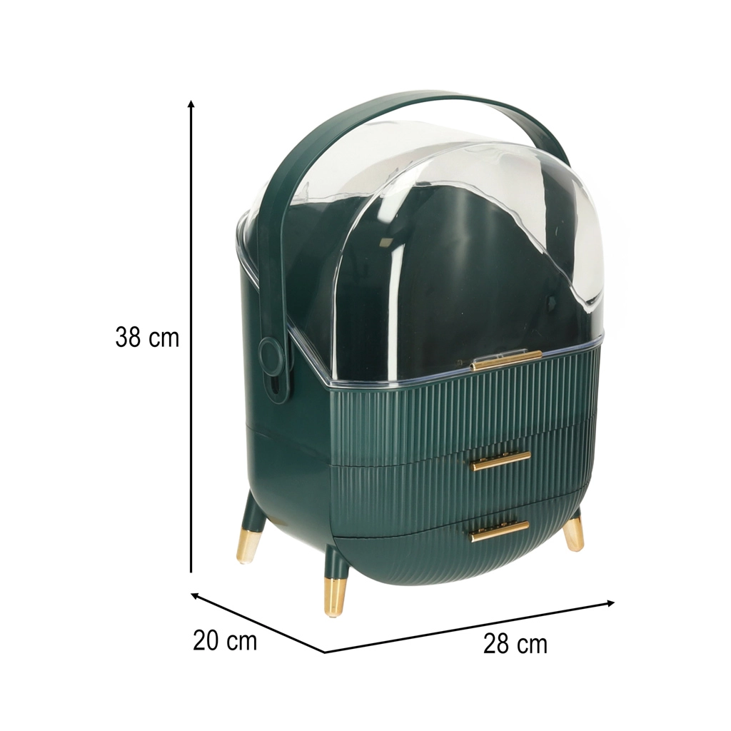 De transparante kap beschermt de inhoud tegen stof en de gouden details zorgen voor een elegante uitstraling. Praktisch in de badkamer, op het bureau of nachtkastje. Iedereen zal de veelzijdigheid, ruimte en het fraaie design waarderen.