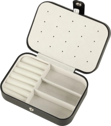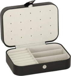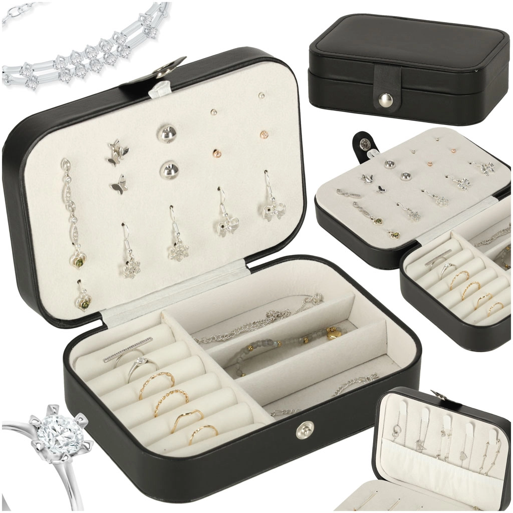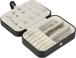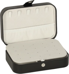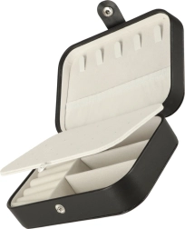 Deze stijlvolle sieradendoos in klassiek zwart met contrasterend licht interieur combineert modern design en praktische functionaliteit. De zachte voering beschermt delicate oppervlakken van sieraden en de doordachte indeling houdt alle accessoires overzichtelijk op hun plek. Ideaal voor in de handtas, koffer en op de kaptafel.