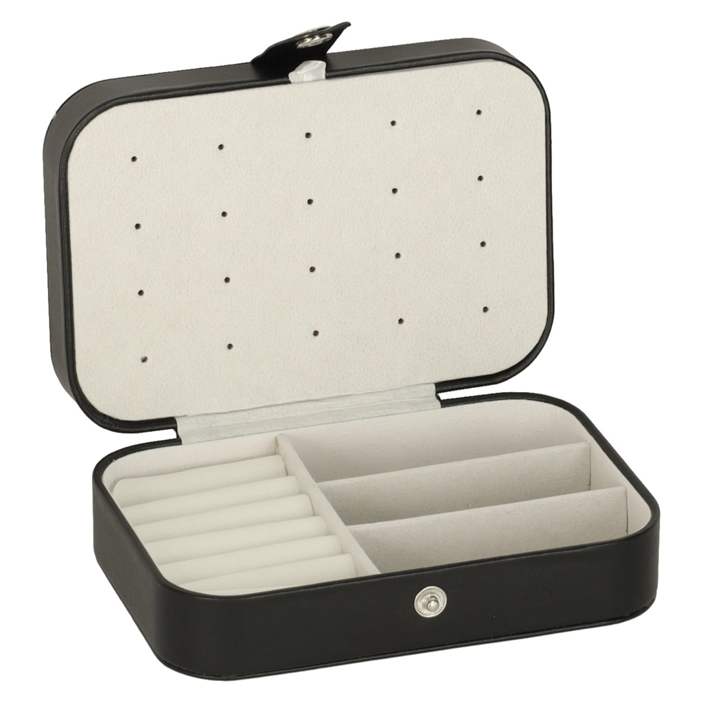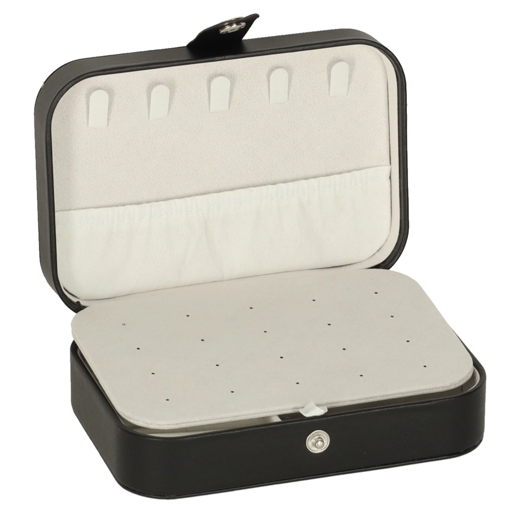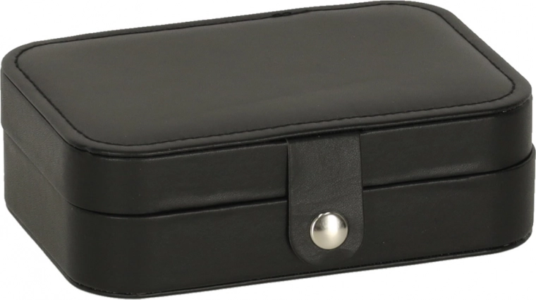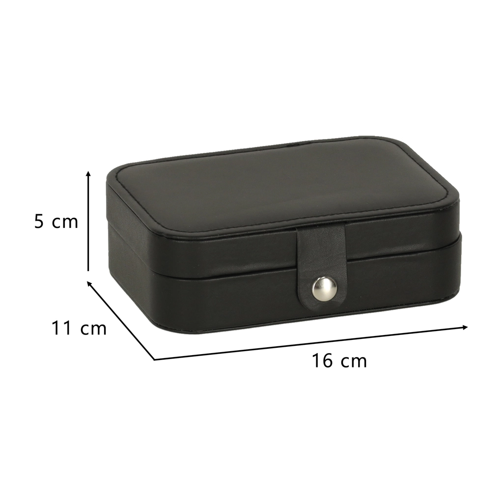Duurzaam oppervlak in zwart, stevige drukknoopsluiting en precisie-stiksel. Sieraden blijven veilig thuis en onderweg, zonder krassen of verlies.