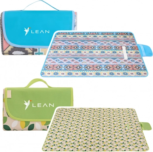 Na gebruik vouw je de deken eenvoudig op tot een compacte tas van 31 × 23 × 5 cm met klittenbandsluiting en een praktisch handvat voor het dragen. Er zijn twee aantrekkelijke patronen om uit te kiezen: groene bladeren of blauwe geometrische motieven – perfect passend bij de zomerse sfeer op het strand en in het park.
