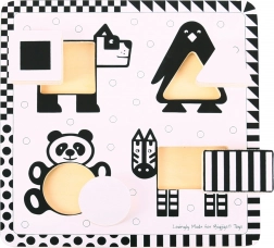 De zwart-witte inlegpuzzel van BIGJIGS TOYS is speciaal ontworpen voor de jongste kinderen. Het contrastrijke ontwerp helpt baby’s beter te focussen en vormen waar te nemen, terwijl vier royale houten puzzelstukken met dierenmotieven comfortabel in de bijbehorende openingen gelegd worden.