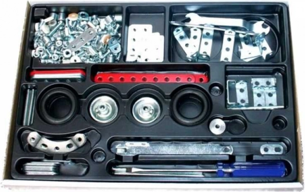 De bouwdoos bevat 230 metalen onderdelen, inclusief schroeven, moeren en andere componenten die in een zwarte lade zijn georganiseerd.