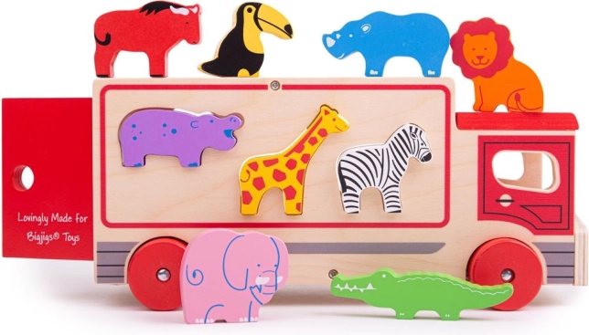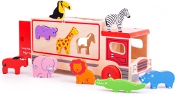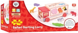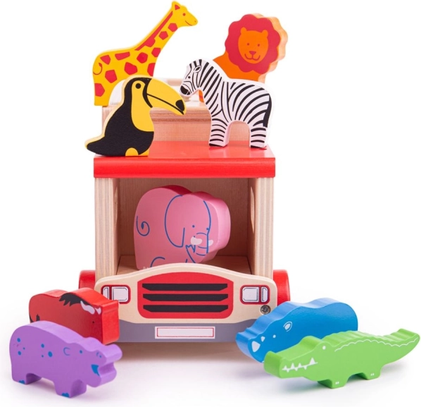 Dit kleurrijke houten speelgoed bevat herkenbare dieren die op de vrachtwagen kunnen worden geladen via speciale gaten in het dak en de zijkanten van het voertuig. Kinderen kunnen vormen sorteren en leren over verschillende dieren, waarna elk dier in de juiste opening kan worden geplaatst. Zodra alle dieren op hun plek zijn, sluiten de achterdeuren van de vrachtwagen en kunnen ze op weg naar een nieuw avontuur.