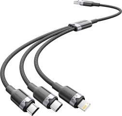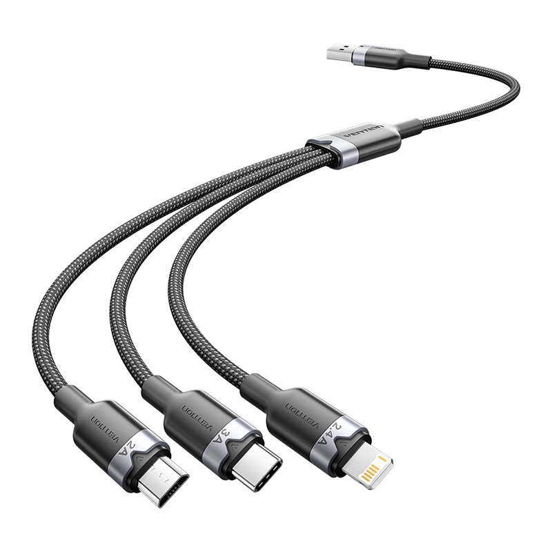 Geniet van veilig en efficiënt opladen met een USB-kabel die drie verschillende connectoren in één praktische uitvoering combineert. De duurzame constructie omvat vertinde koperen geleiders, meerlaagse afscherming en een gevlochten mantel van katoen en PVC. De connectoren zijn nikkelgecoat en de aluminium behuizingen bieden buigbestendigheid.