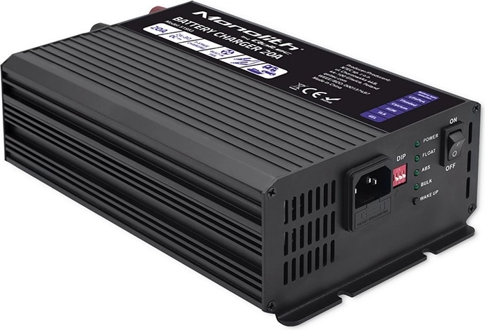 De lader is uitgerust met een DIP-schakelaar voor het wijzigen van de laadinstellingen en maakt het mogelijk om 7 verschillende combinaties in te stellen die overeenkomen met het batterijtype. De robuuste aluminium behuizing is bestand tegen corrosie en de krachtige actieve koeling wordt automatisch ingeschakeld tijdens het laden.