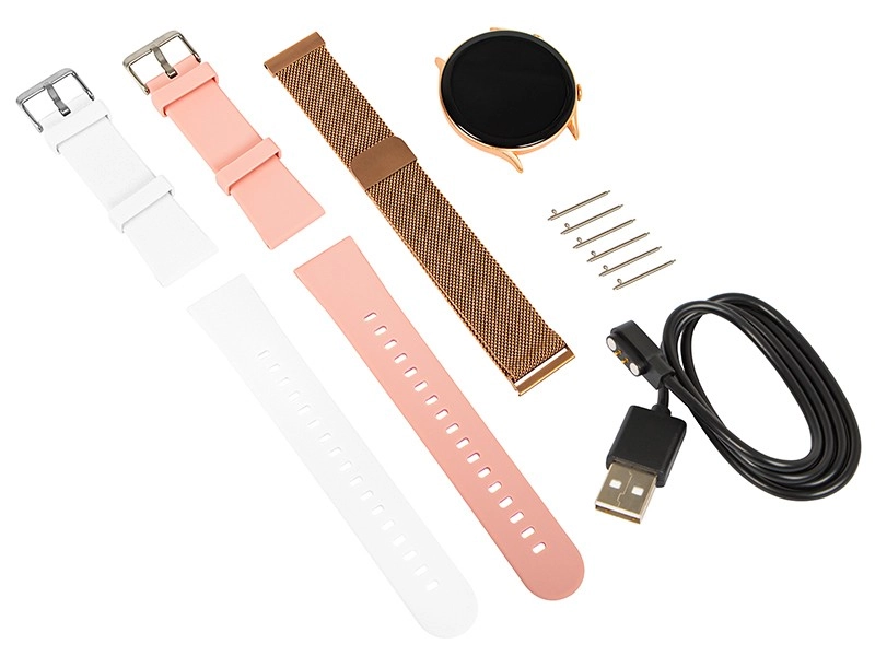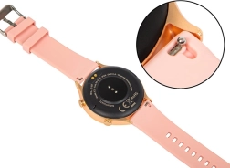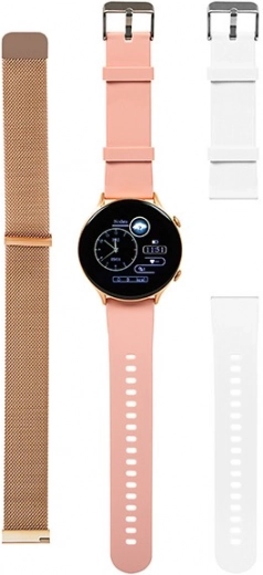 De slimme horloge X19 roze is de perfecte accessoire voor elke dag. Dankzij drie verwisselbare bandjes - goud, wit en roze - pas je je uitstraling eenvoudig aan naar je stemming. Geniet van touchscreen met een resolutie van 360x360 px, dat scherp en helder beeld biedt.