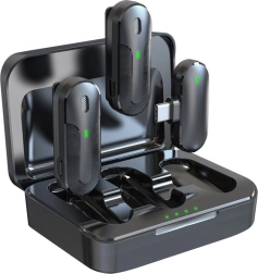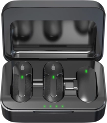 De microfoons zijn uitgerust met praktische clips voor eenvoudige bevestiging aan kleding. De oplaadcase biedt bescherming en verlengt de gebruiksduur, met de mogelijkheid tot vier keer opladen, zodat je de hele dag kunt opnemen zonder je zorgen te maken over een lege batterij.