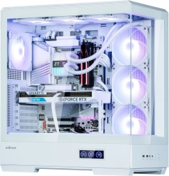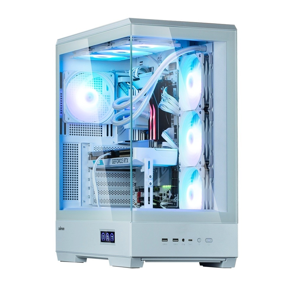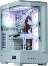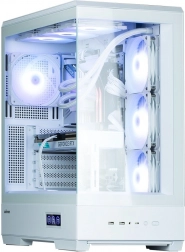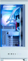 Ontdek de ruime witte pc-behuizing die een modern en strak design naar je bureau brengt. Uitgerust met twee randloze panelen van gehard glas voor een uniek zicht op de build.
