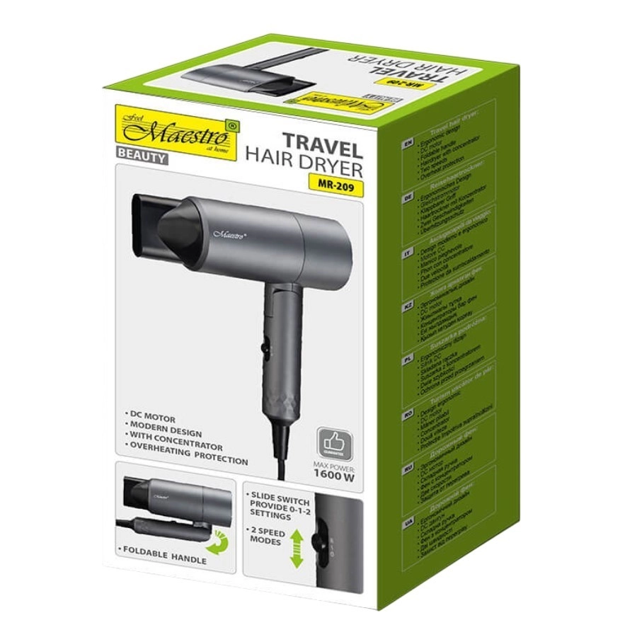 De Maestro MR-209 föhn is uitgerust met een DC-motor die zorgt voor een lange levensduur en stabiele prestaties. Dankzij het inklapbare handvat is hij geschikt voor op reis en de twee snelheidsinstellingen laten je het vermogen aanpassen aan jouw behoeften.