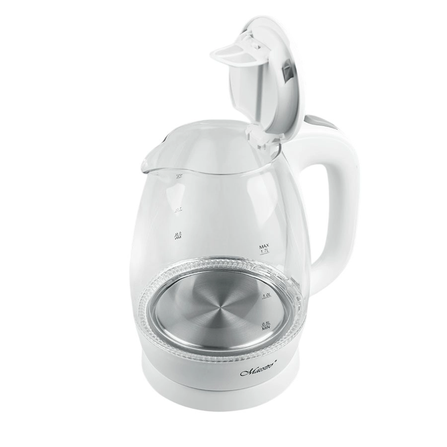 De Maestro-waterkoker biedt blauwe verlichting tijdens het koken, wat je keuken een moderne uitstraling geeft. De praktische openklapbare deksel en de waterpeilindicator maken het vullen en controleren van de hoeveelheid water eenvoudig. Dankzij de 360° draaivoet is de waterkoker geschikt voor zowel rechts- als linkshandigen en de kabelopbergruimte helpt het aanrecht netjes te houden.