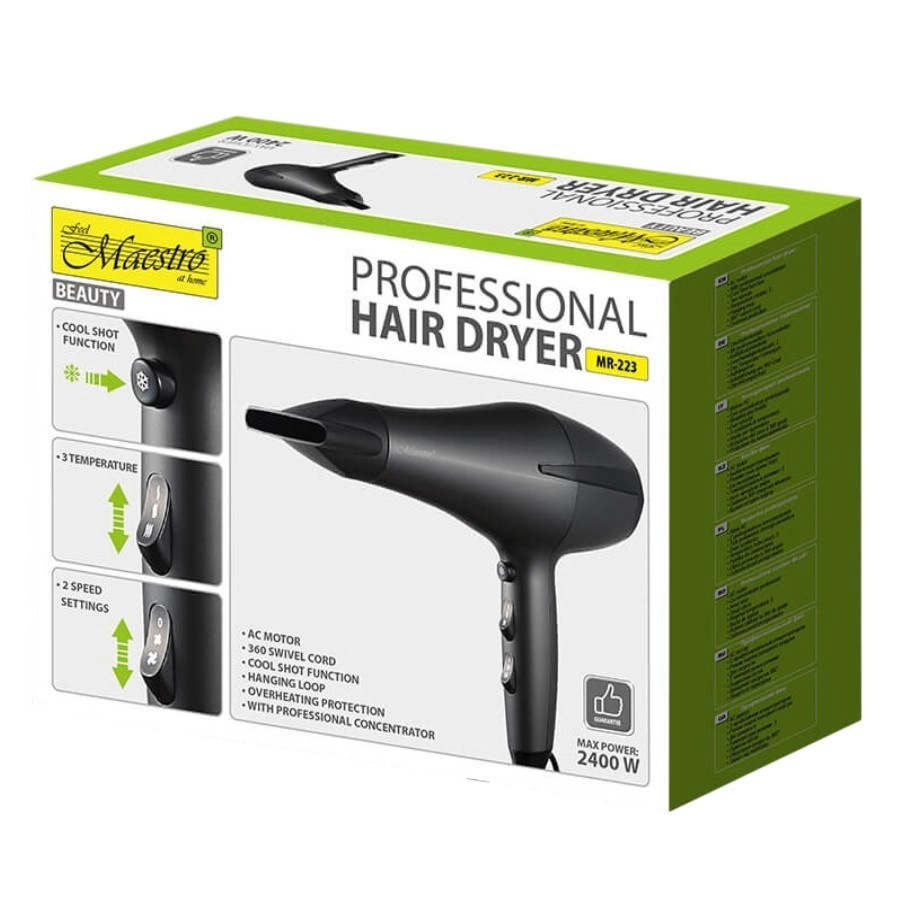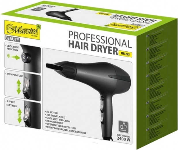 Föhn Maestro 2400W is ontworpen om aan je dagelijkse haarverzorgingsbehoeften te voldoen. Met dit apparaat krijg je een sterke en stabiele luchtstroom die geschikt is voor elke haarlengte en -dikte.