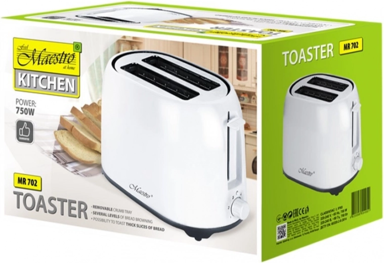 De Maestro tosti-apparaat met een vermogen van 750W is ontworpen voor het gelijktijdig roosteren van twee sneetjes brood, ideaal voor het bereiden van ontbijt voor meerdere personen. De behuizing van duurzaam plastic zorgt niet alleen voor lichtheid, maar ook voor een esthetische uitstraling.