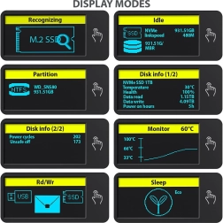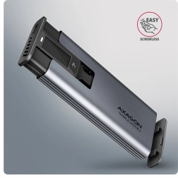 De AXAGON externe behuizing is uitgerust met een geavanceerd LED-display dat direct inzicht geeft in de status van de schijf. Het display toont informatie zoals schijfdetectie, bestandssysteem, temperatuur, schijfstatus, datasnelheid en totale bedrijfstijd. Dankzij realtime temperatuurbewaking en een energiebesparende modus houdt u de controle over de toestand van uw schijf.