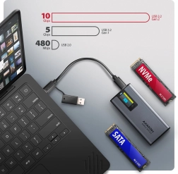De behuizing ondersteunt overdrachtsnelheden tot 10 Gb/s dankzij USB 3.2 Gen 2. Daarnaast is hij compatibel met functies zoals UASP en TRIM en maakt hij het lezen van S.M.A.R.T.-informatie mogelijk. De schroefloze opening maakt de montage van M.2-SSD's eenvoudig. De behuizing biedt montage voor schijven met lengtes van 42, 60 en 80 mm en ondersteunt enkel- en dubbelzijdige schijven.