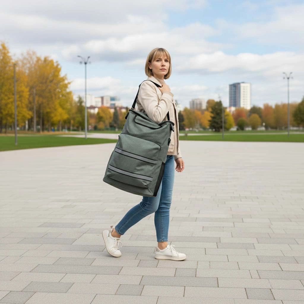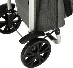 Dankzij de grote wielen en draaibare handgreep is de bediening soepel, zelfs op oneffen terrein. Reflecterende banden vergroten de zichtbaarheid in schemer en donker, zodat u veilig op weg bent. De tas is eenvoudig van het frame te verwijderen, wat dragen en opbergen vergemakkelijkt.