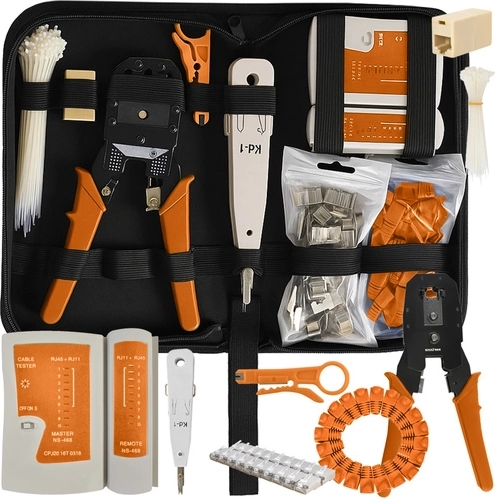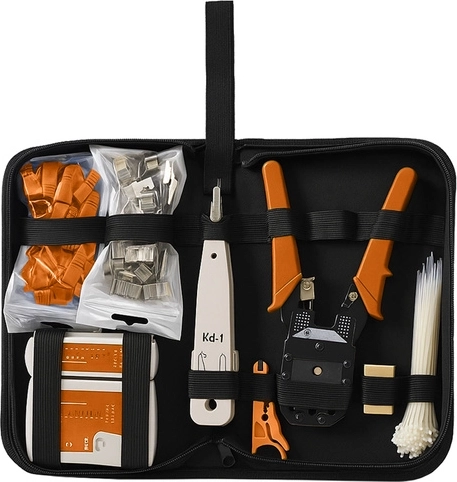 Deze universele netwerkset voorziet in al uw behoeften bij het werken met kabels. Het bevat een tester die met verschillende soorten kabels werkt, die zowel Ethernet- als telefoonkabels ondersteunt, wat het een veelzijdige 2-in-1-oplossing maakt. De gereedschappen zijn ergonomisch en klaar voor gebruik, wat direct installeren of repareren mogelijk maakt.