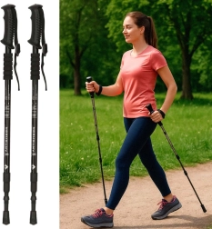 Lichte en duurzame opvouwbare trekkingstokken gemaakt van aluminium, geschikt voor Nordic Walking. Gemakkelijke verstelbaarheid van de lengte met behulp van een vergrendeling en ergonomische handgrepen voor een comfortabele grip.
