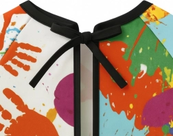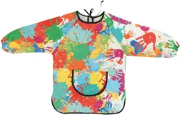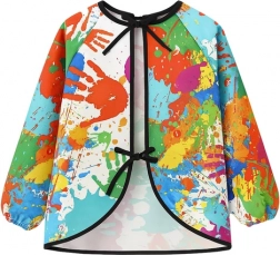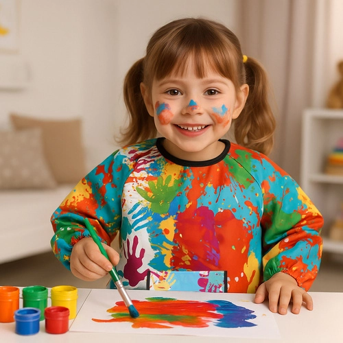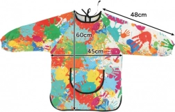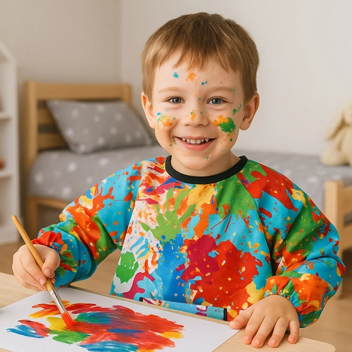 Ontworpen om zich aan te passen aan verschillende lichaamsvormen van kinderen. Striksluiting aan de achterkant en elastische manchetten maken het gemakkelijk aan te trekken en belemmeren de beweging niet tijdens het spelen. Kleine kunstenaars zullen het schort waarderen dankzij de levendige kleuren die uitnodigen om het te dragen.