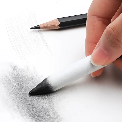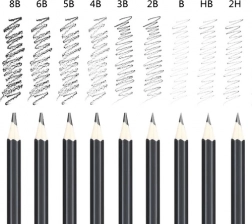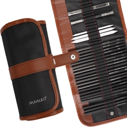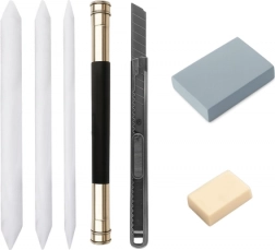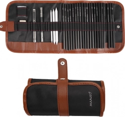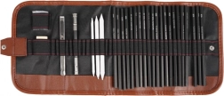 In de specificatie vind je: 18 potloden met verschillende hardheden, 3 houtskoolpotloden, een potloodverlenger, 3 doezelaars, een gum, een papiersnijder en een stijlvolle zwarte etui.