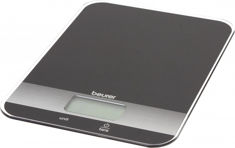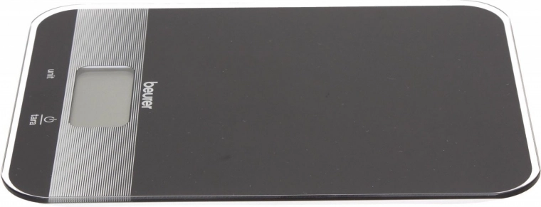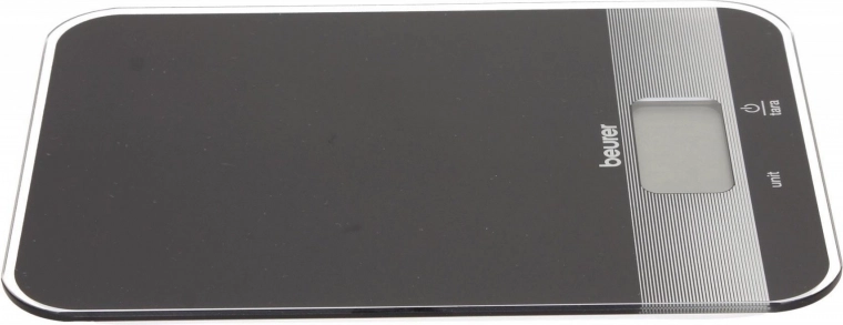 Beurer keukenweegschaal in elegant zwart is uitgerust met een handige tarrafunctie en een goed afleesbaar lcd-scherm. Het glazen oppervlak zorgt voor een moderne uitstraling en eenvoudig onderhoud.