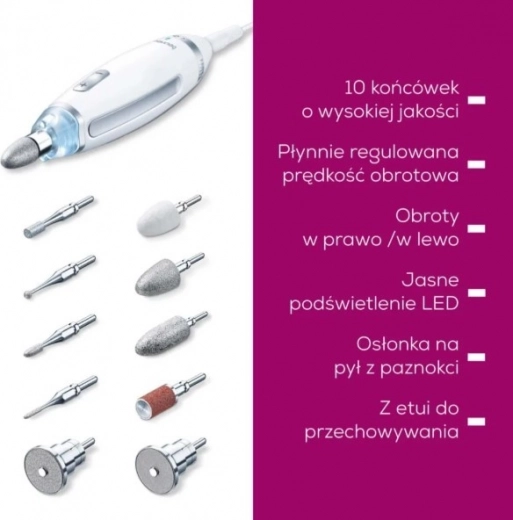 De Beurer MP62 manicure-/pedicureset met tien hoogwaardige opzetstukken en LED-licht is de ideale oplossing voor perfecte nagelverzorging zoals bij de professional.