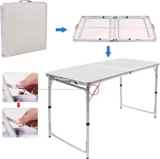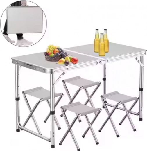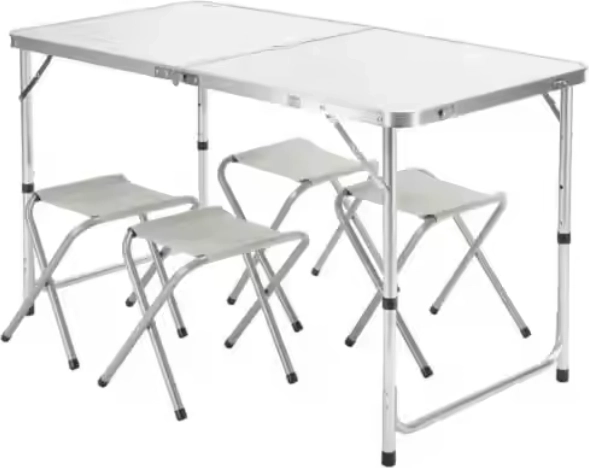 De set bestaat uit een lichte en toch stevige tafel en vier comfortabele stoelen, geschikt voor gebruik bij het kamperen, in het huisje, in de tuin, op het balkon of terras. Het moderne ontwerp met een wit blad en zilveren aluminium frame past perfect in elke omgeving, van de natuur tot de georganiseerde ruimte van thuis. De set is niet alleen eenvoudiger voor het organiseren van buitenontspanning, maar bespaart ook ruimte - na het opvouwen kan het gemakkelijk in een kast, garage of onder een bed worden opgeborgen.