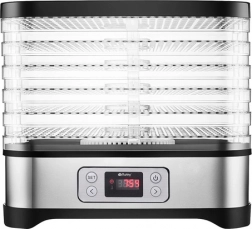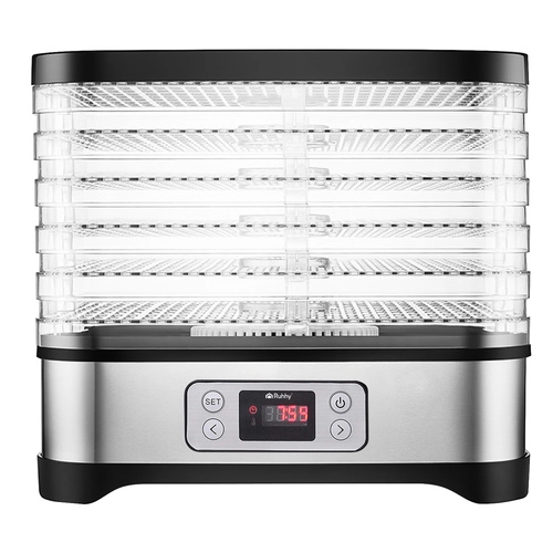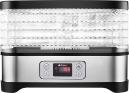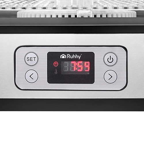 Universele Ruhhy-droger met een vermogen van 400 W voor eenvoudig drogen van paddenstoelen, fruit, groenten en kruiden. Uitgerust met 5 trays met een totale capaciteit van 10 liter, instelbare temperatuur (35–70°C) en een goed leesbaar display met timer tot 24 uur. De ideale keuze voor thuis conserveren het hele jaar door.